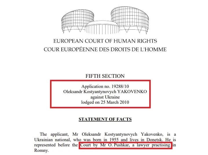 Інтереси О. Яковенка представляв юрист п. О. Пушкарь. Посилання на документ ЄСПЛ.